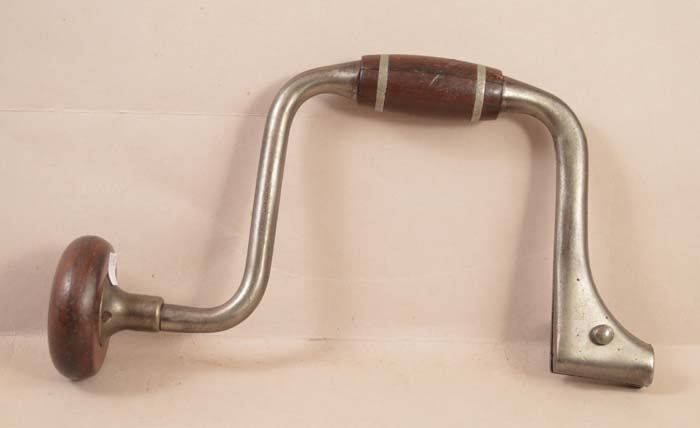 - MILLERS FALLS NO. 7312B WHIMBLE BRACE. 12 inch sweep. Completely functional. Missing some nickle plating. Some dings on the stained-hardwood handle and pad, G+ .............. Sold $85.00